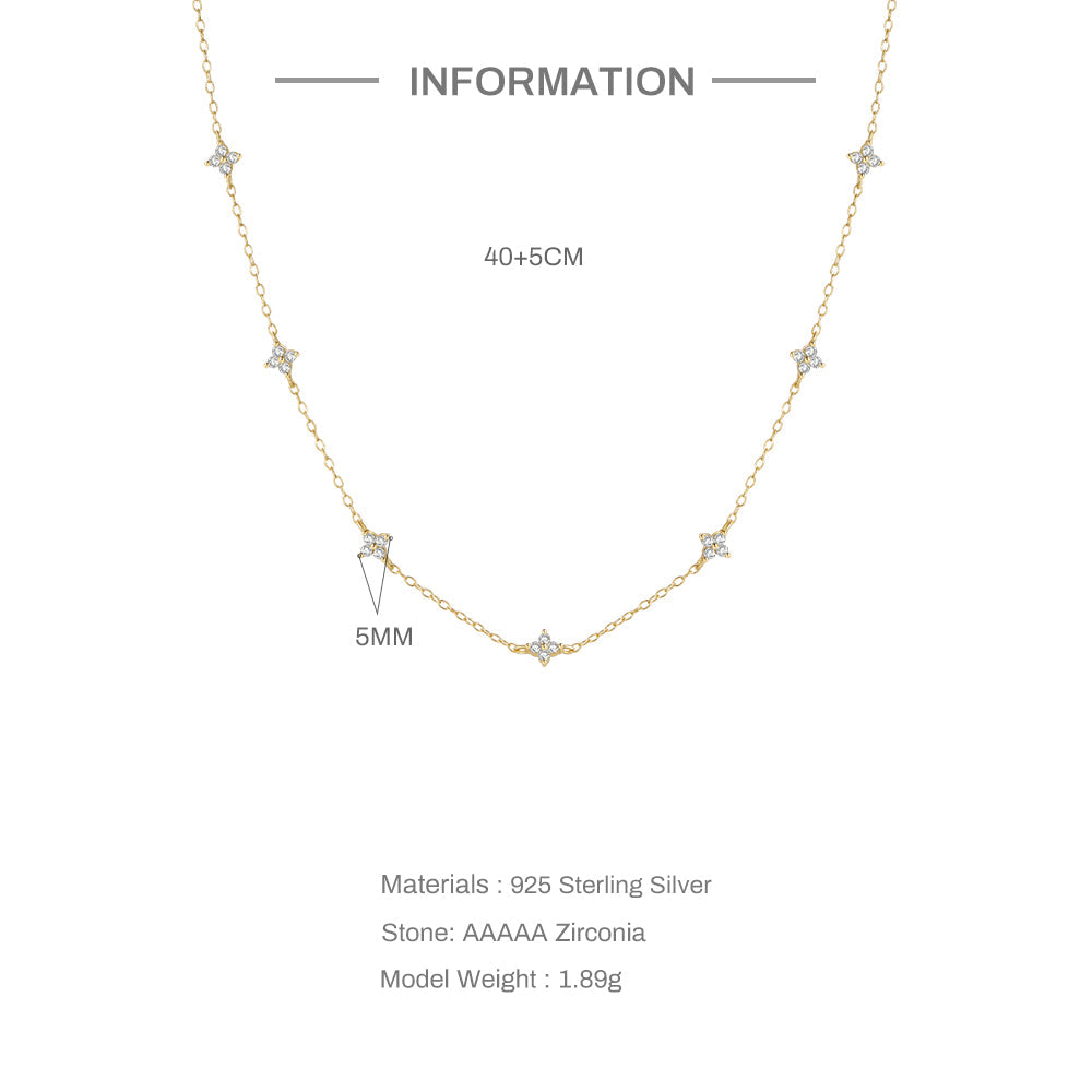 925 Silver Sterling 4 Star Flower Shiny Crystal Drop Necklace choker